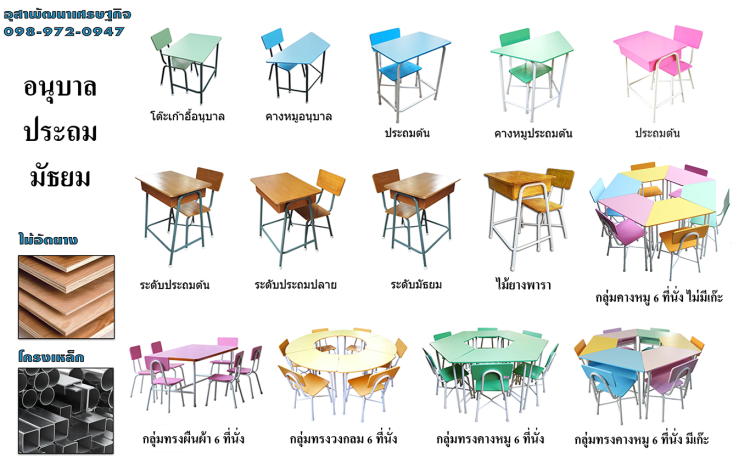 มีหลากหลายแบบและหลากหลายระดับชั้นได้แก่ โต๊ะเก้าอี้นักเรียนอนุบาล โต๊ะเก้าอี้นักเรียนประถม โต๊ะเก้าอี้นักเรียนมัธยม โต๊ะเก้าอี้นักเรียนคางหมู โต๊ะเก้าอี้นักเรียนคางหมูหมู่ โต๊ะเก้าอี้นักเรียนวงกลม โต๊ะเก้าอี้นักเรียนวงกลมหมู่ โต๊ะเก้าอี้นักเรียนหมู่ต่างๆ โต๊ะเก้าอี้นักเรียนชุด โต๊ะเก้าอี้นักเรียนแบบสั่งทำ โต๊ะเก้าอี้นักเรียนนั่งรวมหลากหลายที่นั่ง โต๊ะเก้าอี้นักเรียนนั่งรวม 6ที่ โต๊ะเก้าอี้นักเรียนนั่งรวม 8ที่ โต๊ะเก้าอี้นักเรียนนั่งรวม 10ที่ โต๊ะเก้าอี้นักเรียนครึ่งวงกลม และ โต๊ะเก้าอี้นักเรียน มอก. ทุกระดับชั้น