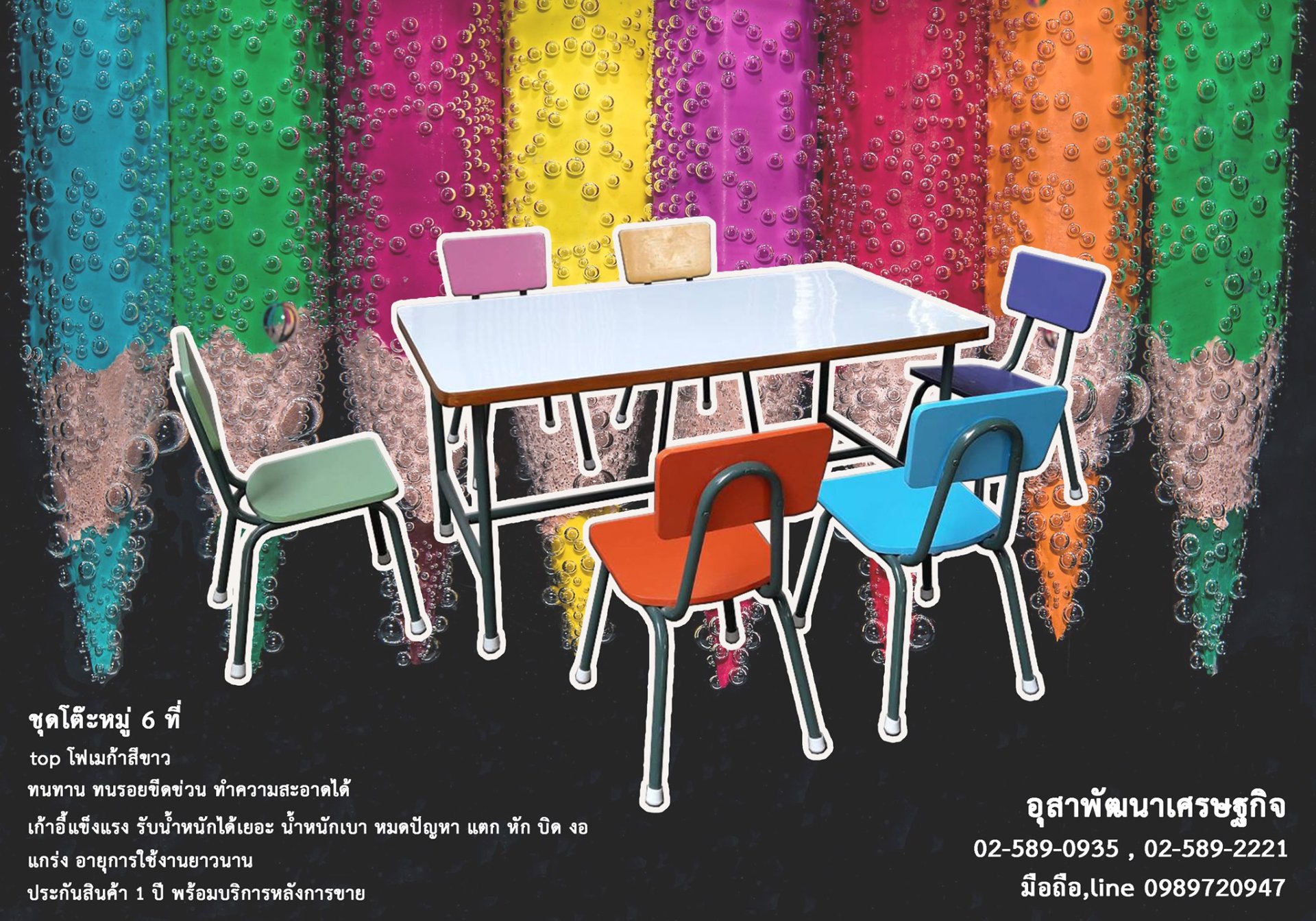 หมู่คางหมู 6 ที่นั่ง หมู่วงกลม 6 ที่นั่ง โต๊ะหมู่ 6 ที่นั่งทั่วไป มีครบ ตั้งแต่ระดับอนุบาลถึงมัธยม รูปแบบการออกแบบที่ลงตัว กระทัดรัด แข็งแรงทนทาน แต่ น้ำหนักเบา จัดเก็บเคลื่อนย้ายสะดวก